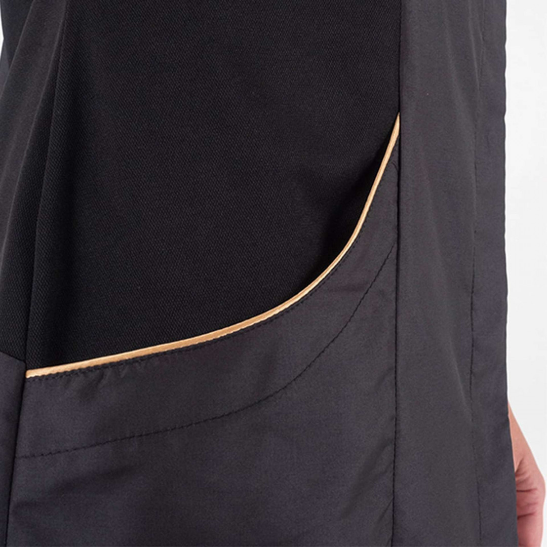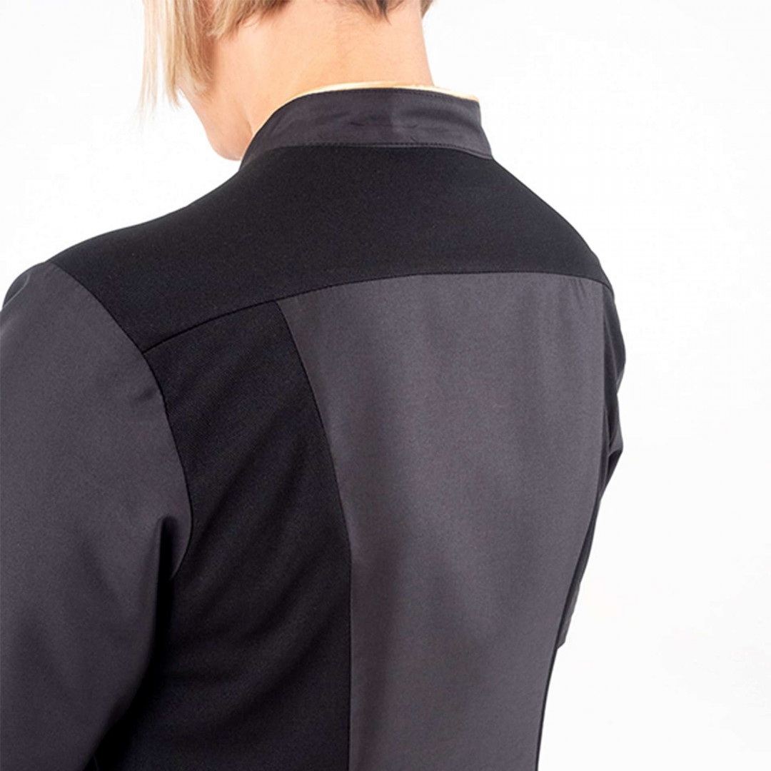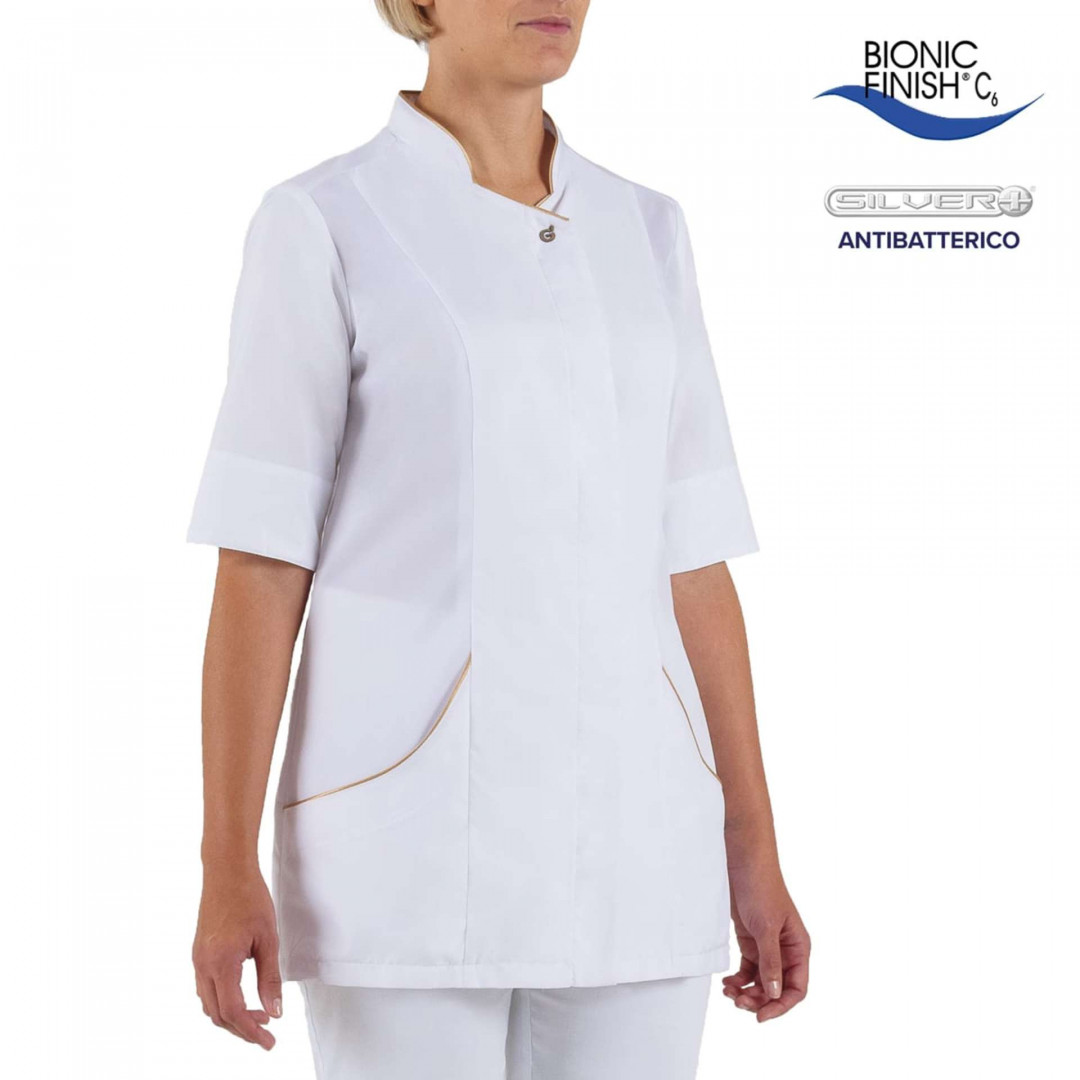 La casacca da lavoro Atena si caratterizza per leggerezza, eleganza e professionalità. Dalla vestibilità aderente arricchita di comfort grazie ai fianchetti e allo spallone in leggerissimo poliestere Airweb, è proposta nelle intramontabili varianti nero e bianco, con un tocco moderno grazie all’inserimento di un profilo color oro,che risalta il collo alla coreana e le due tasche sul davanti.È realizzata in microfibra, uno nostri tessuti best seller, a cui – oltre all’esclusivo sistema Bionic-finish, abbiamo aggiunto un trattamento anti microbico che offre una freschezza duratura e una vita più lunga a tutti i prodotti trattati. A questo, si aggiungono il trattamento Wash & Go, che consente un’asciugatura rapida senza il bisogno di stiratura, e il sistema di confezione Flexfit System che rende questa casacca da lavoro ancora più ergonomica.Il tocco finale? Un solo automatico logato a vista in galvanica ottone anticato che delinea la chiusura, caratterizzata da un abbottonatura nascosta.