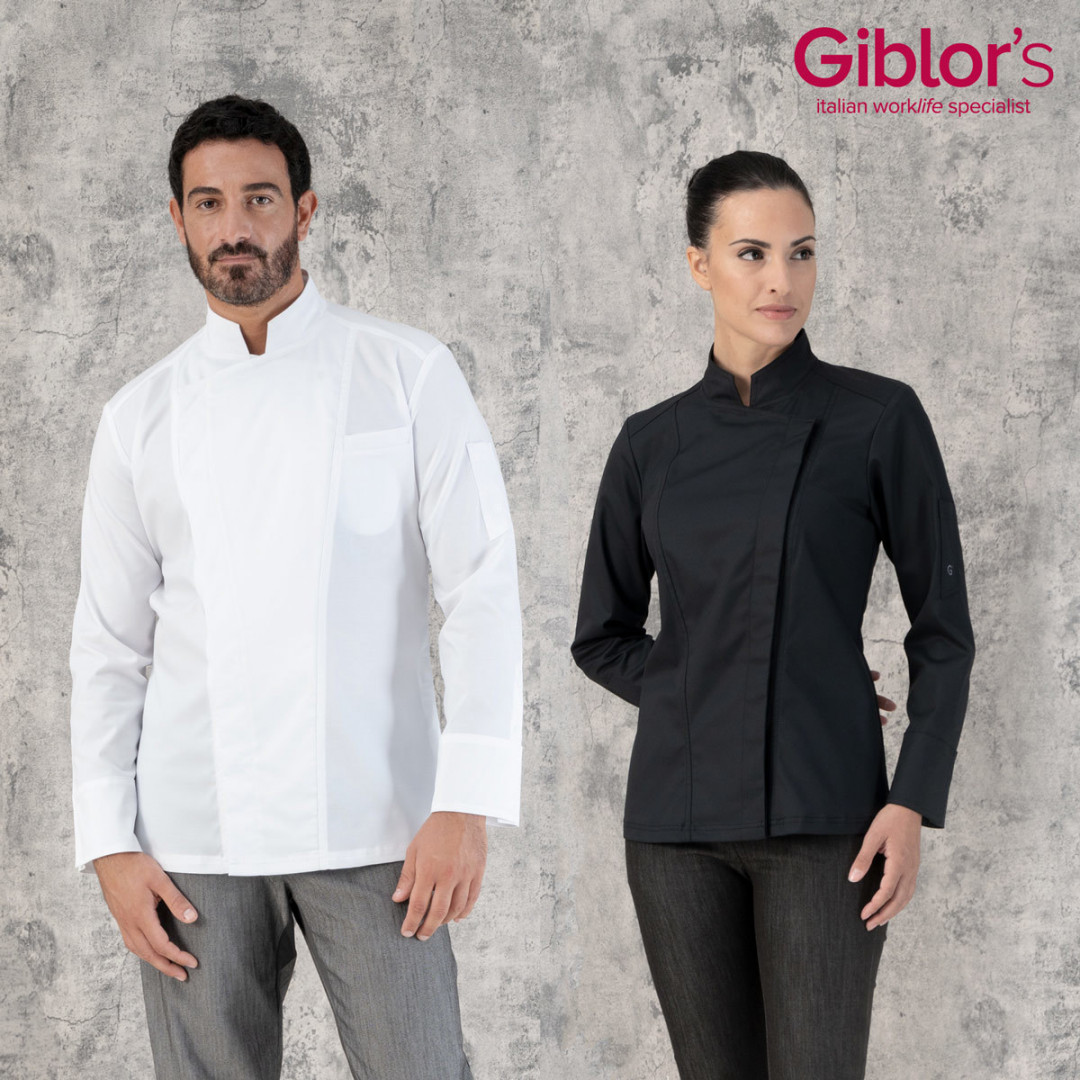 Darcy è una giacca da chef frutto di grande ricerca stilistica in ambito moderno. Presenta il collo alla coreana a squadra, che riprende un disegno ottagonale, e ben si accorda con l’abbottonatura doppio petto nascosta a sei automatici, sottolineata da due tagli incorniciati da una doppia impuntura. La giacca Darcy e realizzata in TencelTM elasticizzato di nuova generazione, di alta qualità e dalle eccellenti performance, resistente alle alte temperature. Presenta un taschino lato cuore ed il portapenne logato con il ricamo G’, ed è caratterizzata dalla manica con polso a camicia con incrocio diagonale che ne permette l’apertura, per poter essere facilmente arrotolata. L’intera giacca è rifinita con impunture a due aghi ed ha due tagli posteriori che ne asciugano la linea.